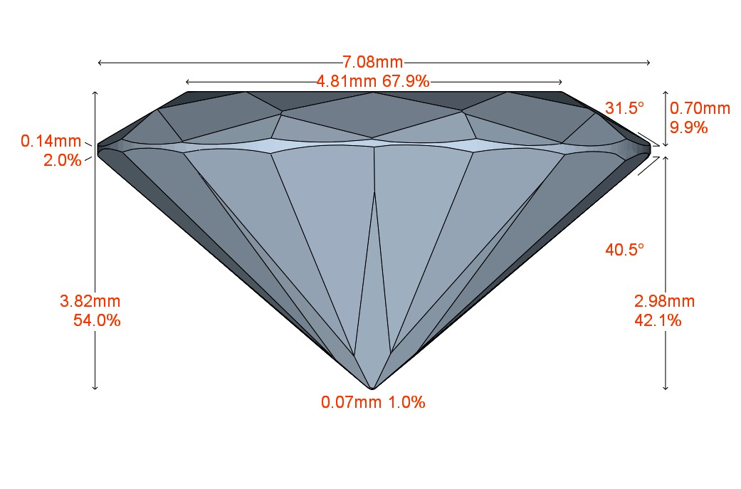 Talla: BRILLANTE moderna Peso: 1,13 ct. Pureza: SI1 Fluorescencia: Media Color: CRYSTAL K Diámetros: 7,06 - 7,09 mm. Altura: 3,82 mm. Proporciones: Buenas (Good) Filetín: 2.0% Tabla: 68.0 % Corona: 9.5% Culata: 42.0% Culet: 1.0% Pulido: Muy bueno (Very Good) Simetría: Aceptable (Fair) Observc.: Filetín esmerilado, fino, algo desigual Culet pequeño, desportillado