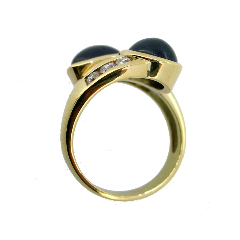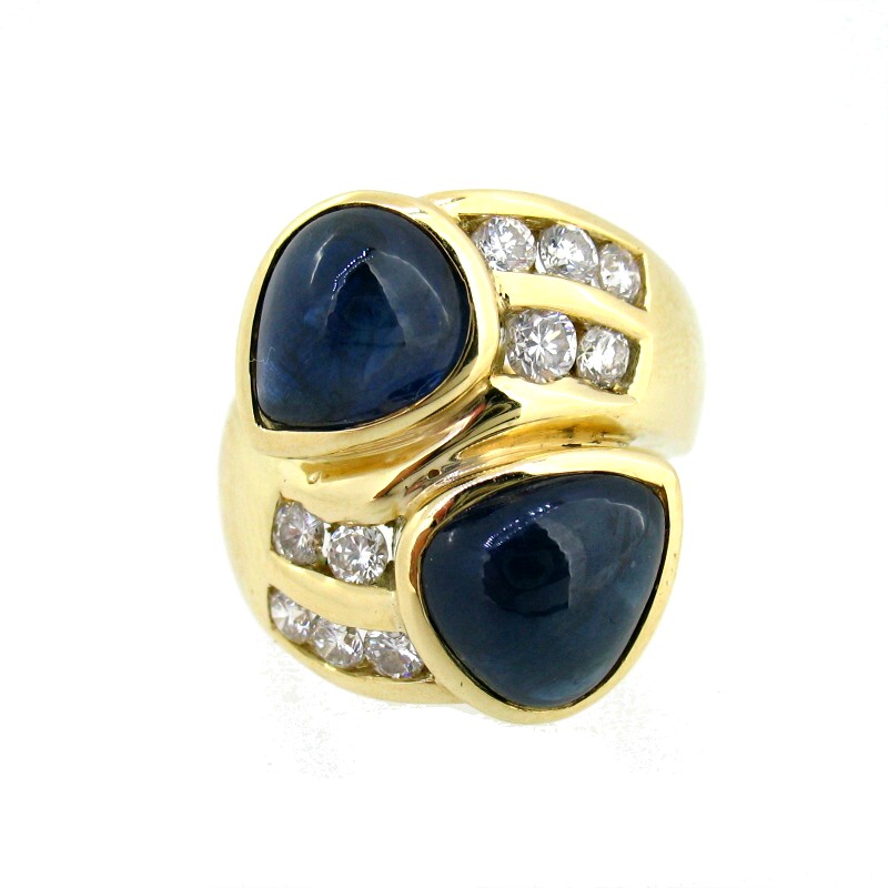 | Descripción | Sortija de brazo de media caña en progresiópn de anchura. Sus extremos están abiertos y se sobrepasan y enfrentan. Cada extremo lleva una montura que engasta en chatón un zafirto de talla cabujón. Los extremos dedel brazo están decorados con dos filas en sentido longitudinal, de diamantes engastados en carril. | ||||||||||||||||||||