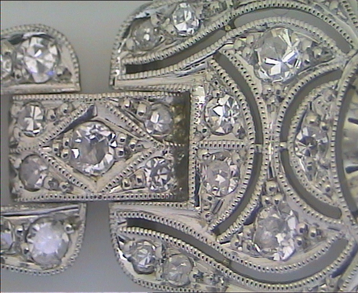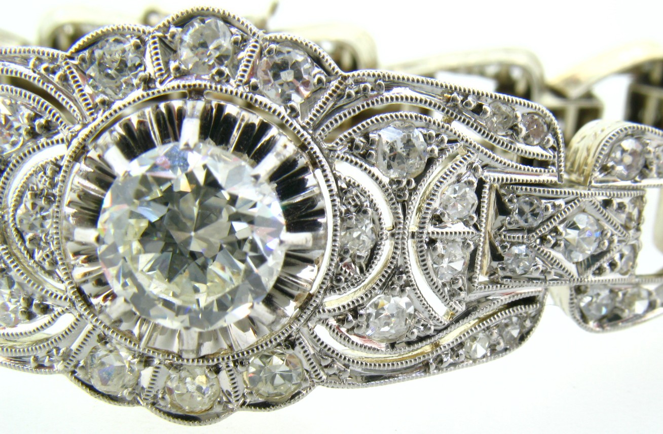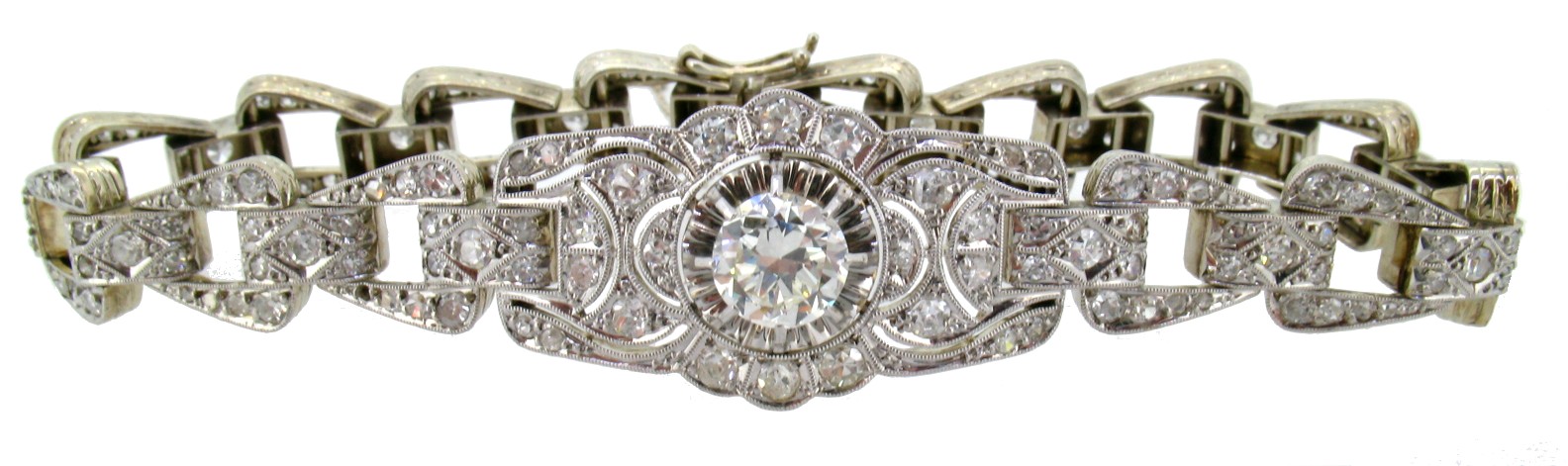 Pulsera de eslabones triangulares calados articulados con abrazaderas, todos decorados con diamantes engastados con granos y con los bordes y marcos grafilados. En el motivo central se encuentra una gran montura "ilusión" que engasta con garras un diamante. A ambos lados , de forma simétrica y con calados hay un decorado de diamantes engastados de la misma manera que los eslabones. El cierre es de cajón con lengua, seguro de "ocho" y cadena de seguridad. La bata lateral de todas las piezas está decorada con un grabado de diseño vegetal en semirelieve.