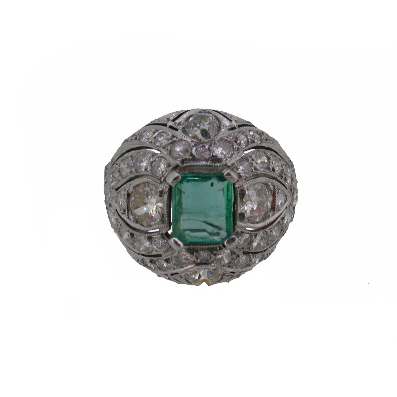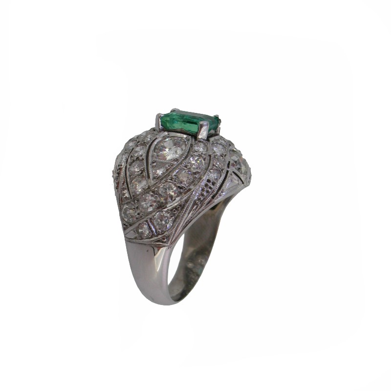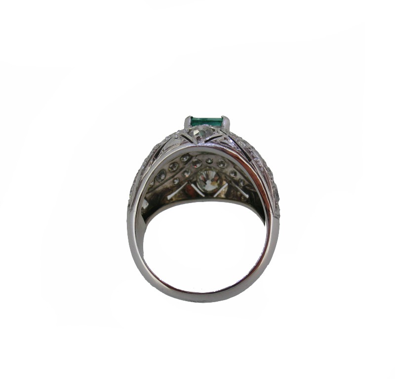 Sortija bombé que lleva una montura central rectangular de cuatro garras con una esmeralda engastada. Alrededor de ella tiene una cenefa decorada con calados y diamantes engastados con granos y bordes grafilados, dispuesto de forma simétrica a ambos lados de la montura central. El brazo es de media caña en progresión de anchura.