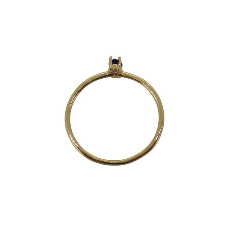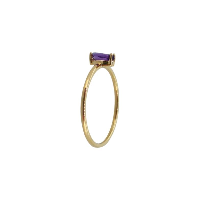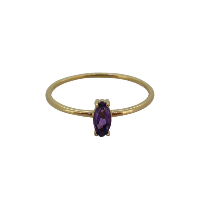 Sortija solitario de anillo de hilo redondo uniforme con una montura marquisse de cuatro garras de extremos redondeados, con una amatista engastada.