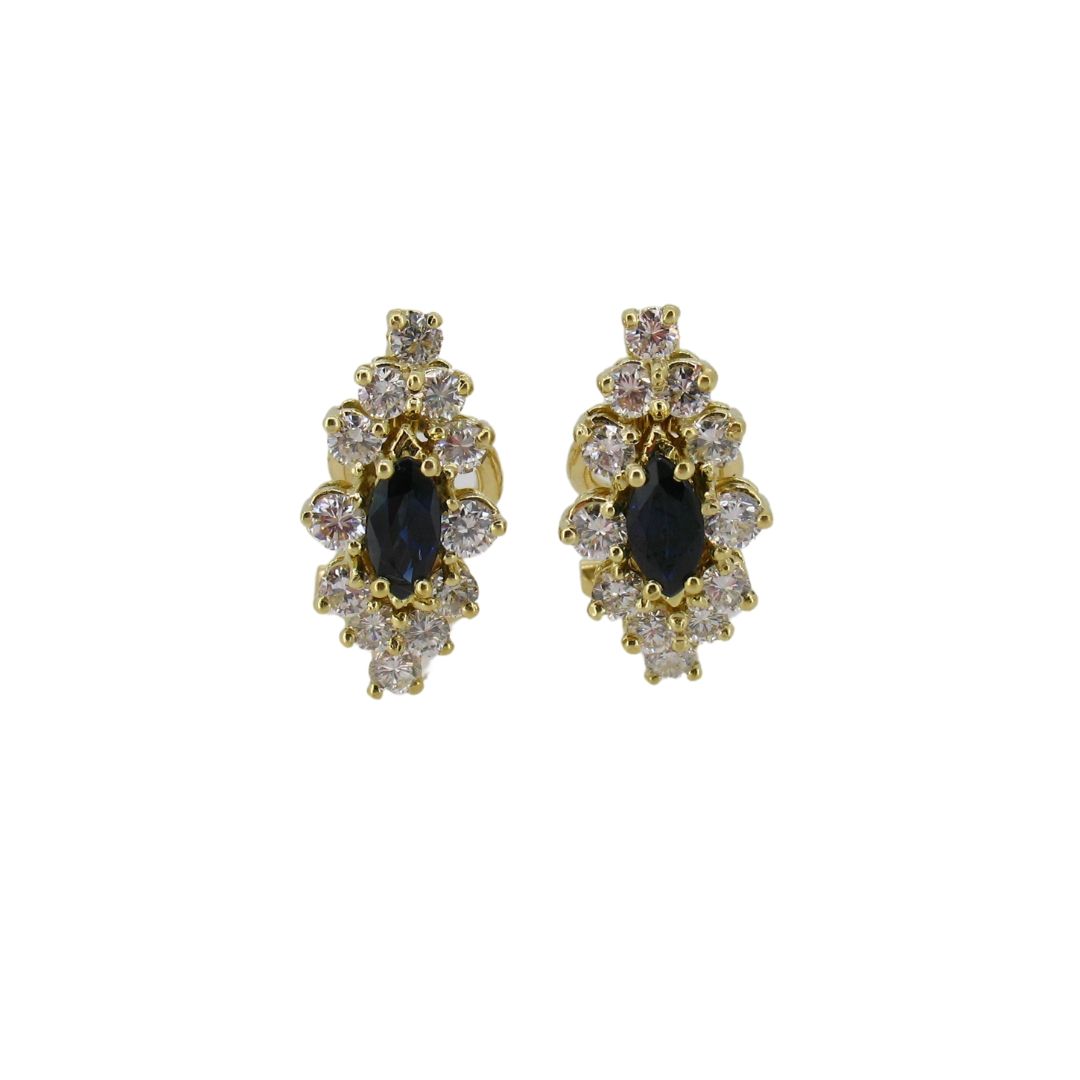 Pendientes con un centro con orla en forma de rombo. En el centro lleva una montura en forma de marquise con un zafiro engastado en cuatro garras de hilo redondo. La orla está compuesta por monturas redondas en diferentes alturas con diamantes engastados en garras de hilo redondo. Las garras se prolongan hacia abajo formando una bata de cesta. Tiene un orejal y con cierre omega basculante.