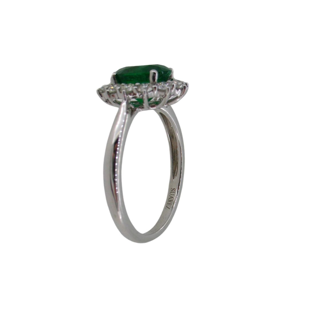 | Descripción | SORTIJA CON ESMERALDA Y DIAMANTES Sortija de tipo rosetón. Lleva una montura central oval de cuatro garras de hilo media caña con una esmeralda engastada. A su alrededor, en plano inferior, hay una orla de diamantes engastados en monturas de garras de hilo compartidas. Las garras del perímetro se prolongan hacia abajo formando una bata de cesta. El brazo es de media caña con sus extremos terminados en cuchillo calado en el lateral de la bata. La base de este conjunto lleva un forro calado. En su interior lleva el grabado de la firma SUAREZ.