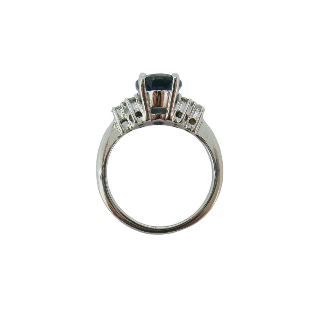Sortija de brazo de ligera media caña en progresión de grosor y anchura. El brazo termina en cuchillo en la parte en los laterales de un grupo de monturas. La central es oval con un topacio comercializado como "london blue" engastado con cuatro garras de hilo de media caña. A cada lado, en un plano inferior hay un conjunto de tres monturas redondas dispuestas en forma de triángulo donde hay engastados tres diamantes con cuatro garras de hilo. Tanto la montura central como las pequeñas de los lados presentan una bata calada por donde entra la luz y en la parte interna del anillo un forro calado también para dejar pasar la luz.