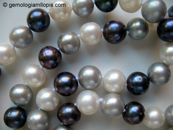 Perlas de agua dulce esféricas. Las perlas de color negro están teñidas artificialmente.