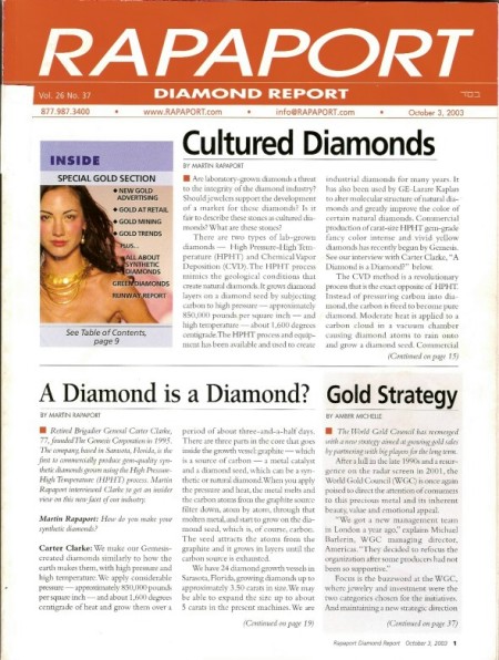 Notas | Diamantes cultivados. Estrategia para el oro. Diamantes fabricados con tecnología CVD . El proceso kimberly se desarrolla. Diamantes verdes. El oro en el mercado israelí. |
