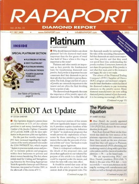 Notas | Informes de mercado: compras y ventas en USA, Hong Kong, Israel, India Rusia , Antwerp y japón. DTC sube los precios. Interviú sobre el platino , De Beers en Rusia, Subastas en Hong Kong. |